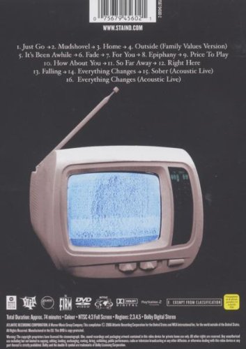 Staind "The Videos" DVDOver 10 years, Staind have produced 4 platinum albums, had numerous Top 10 & #1 songs & have sold in excess of 12,000,000 units. Now, for the first time, all their hit videos are together on one DVD! This will coincide with their Greatest Hits CD. Besides the hit videos like ''It’s Been Awhile,'' ''Mudshovel'' and ''Right Here,'' there are many hard-to-find Staind videos: the worldwide smash, ''Outside'', which rocketed the band to fame in 1999, has not been commercially available for four years. Their first-ever video, ''Just Go'', available for the first time, has not been seen since a short viewing on